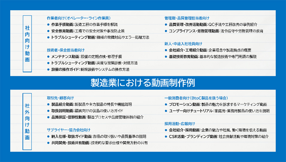 製造業における動画制作は、対象者の違いで大きく二つに分類できます。作業者や技術者、保全担当者、品質管理担当者などの従業員に向けた「社内向け動画」と、取引先や顧客、サプライヤー、求職者などに向けた「社外向け動画」との二分類です。