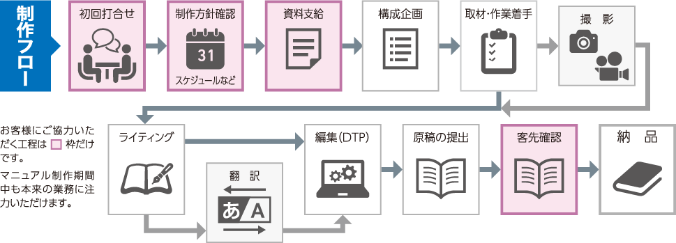 製造業の現場業務をマニュアル化する目的のひとつに、「作業にあたるメンバー全員に正しい手順を伝え、生産性を向上させること」があります。 作業手順書の運用により、安全・安心、作業効率化、品質の安定化、属人化の回避、従業員の育成などの多くのメリットが見込め、生産性の向上が期待できます。 しかしながら、人手不足やノウハウ不足により十分に活用ができていない状況が見受けられます。これまで自社で運用してきた作業手順書の制作業務を外部に委託することで手順書制作にかかわる労力を省力化し、本来やるべき作業効率の向上につながる業務を推進いただけます。
